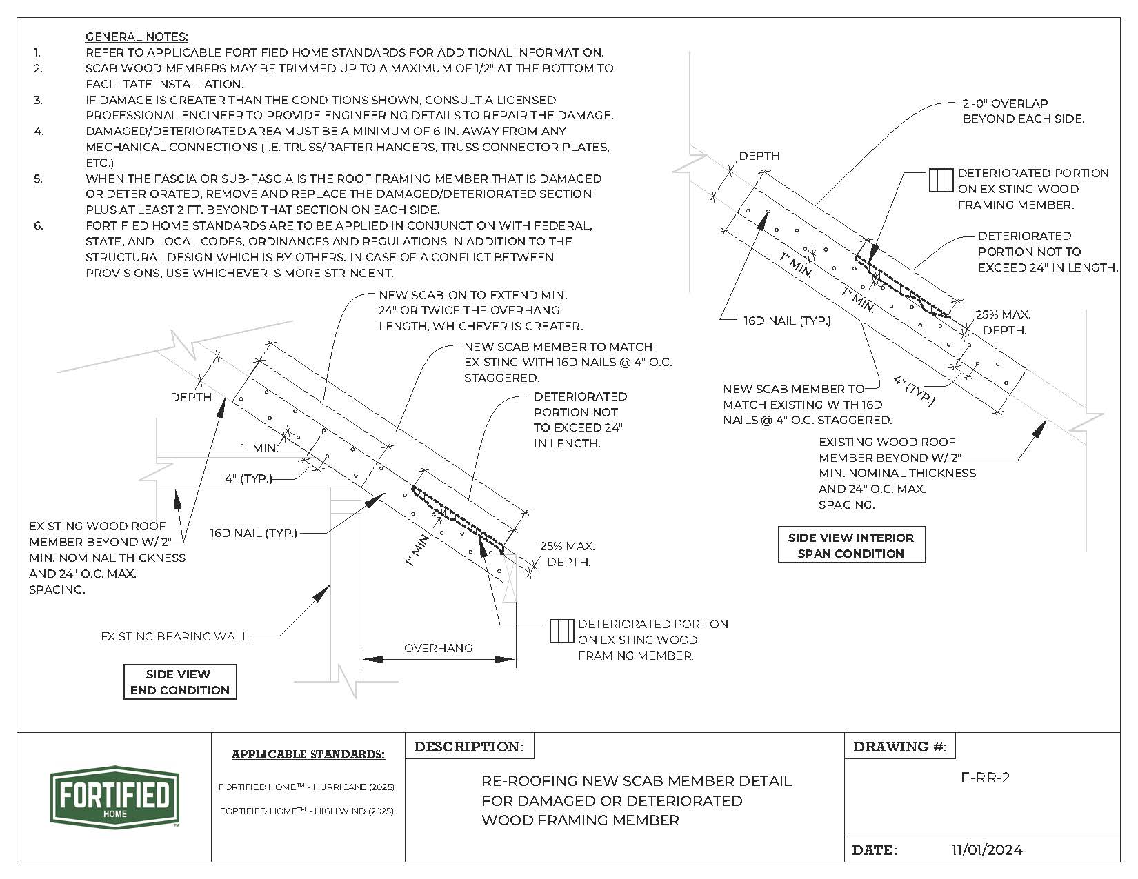 F-RR-2 Re-Roofing New Scab Member Detail for Damaged or Deteriorated Wood Framing Member |