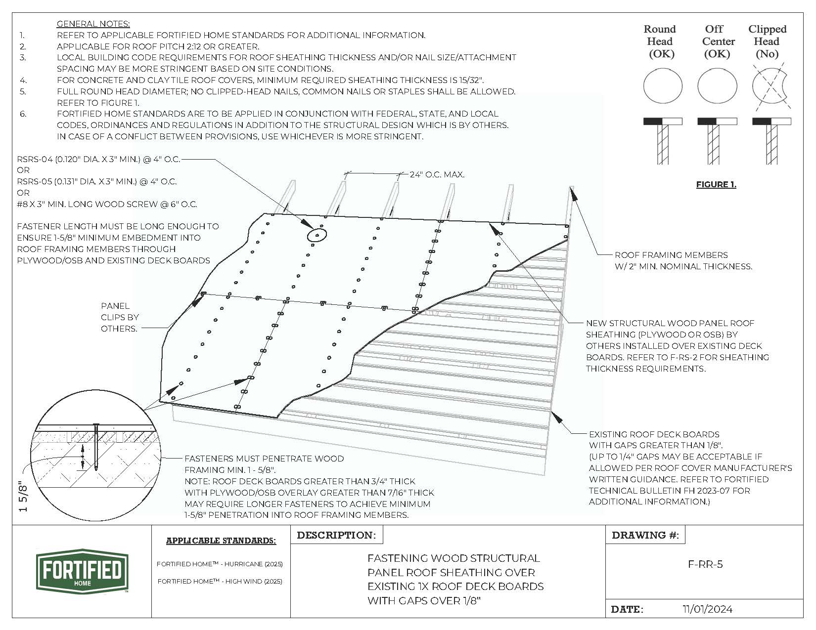 F-RR-5 Fastening Wood Structural Panel Roof Sheathing Over Existing 1x Roof Deck Boards with Gaps |