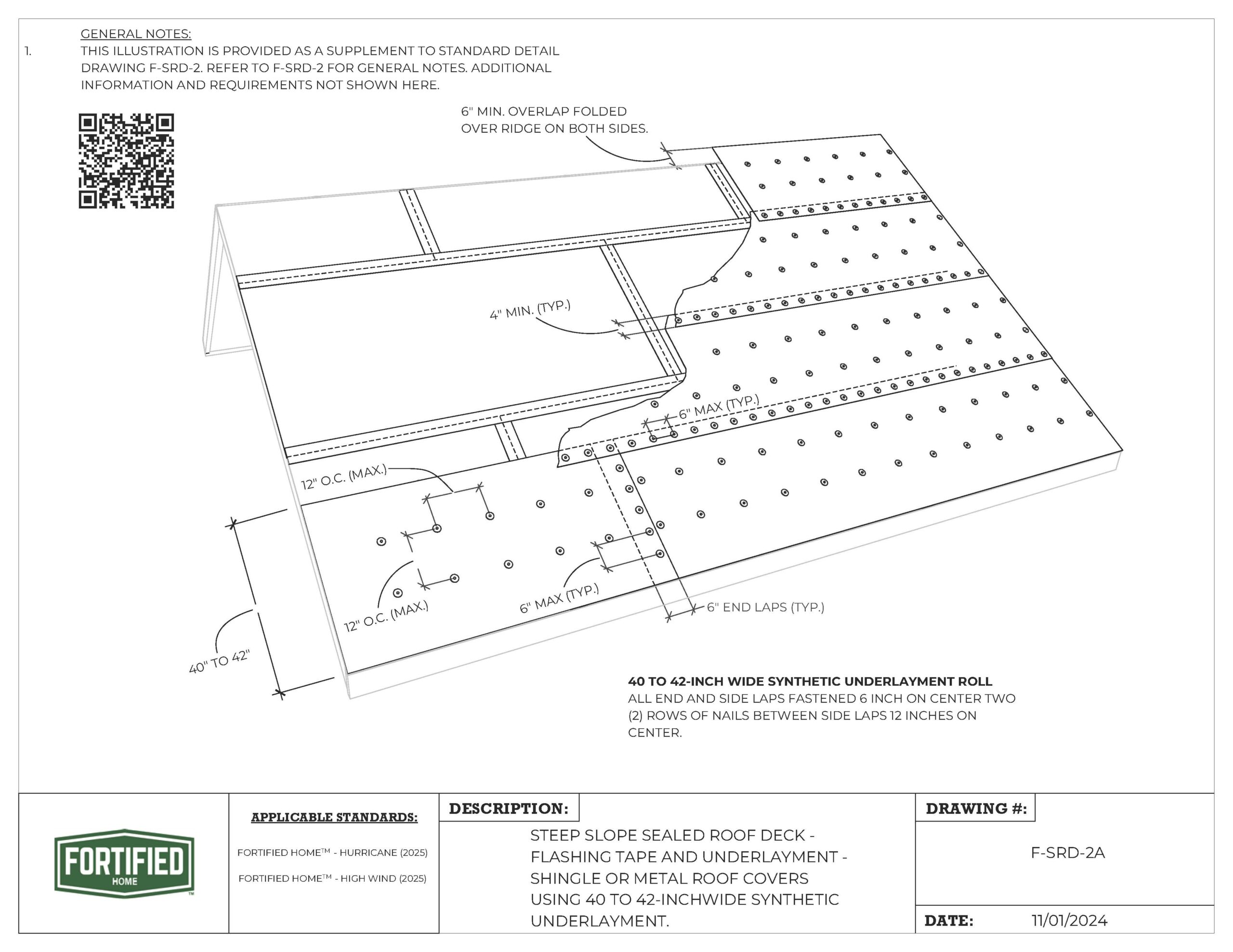 F-SRD-2A Sealed Roof Deck – Flashing Tape and Underlayment- Shingle or Metal Roof Covers Using 40-42 Inch Wide Synthetic Underlayment |