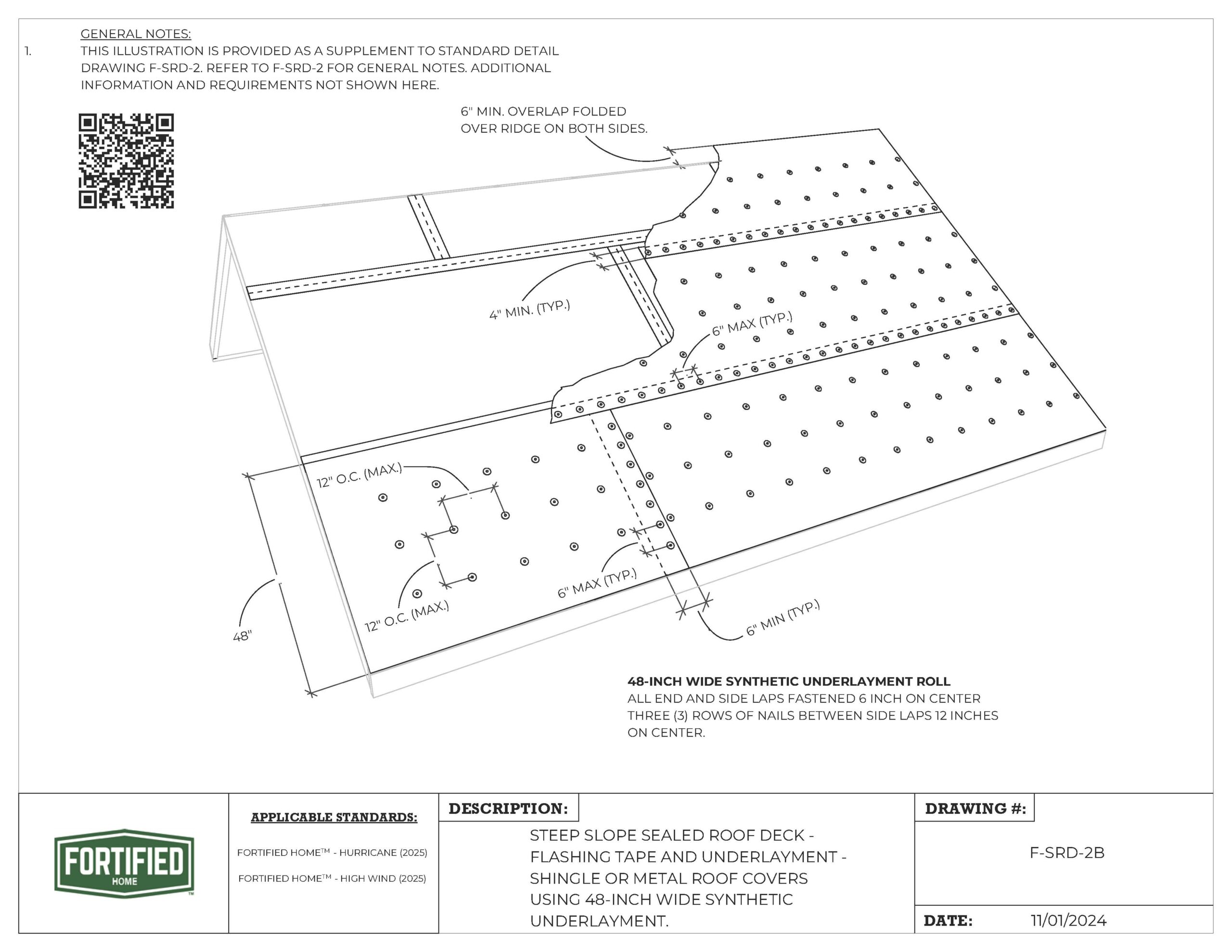 F-SRD-2B Sealed Roof Deck – Flashing Tape and Underlayment- Shingle or Metal Roof Covers Using 48 Inch Wide Synthetic Underlayment |