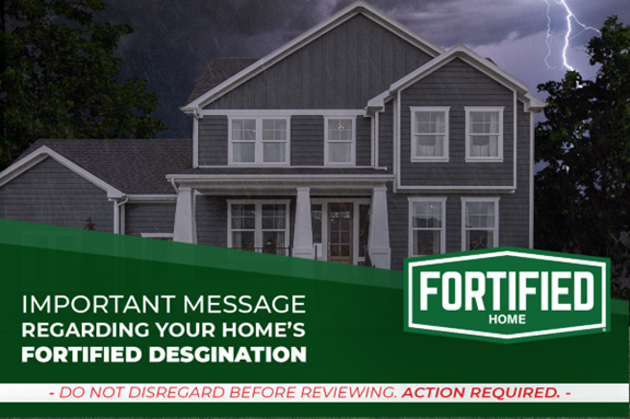 Recently, some re-designation dates were updated to spread requests for re-designation inspections throughout the year helping to ensure local evaluators can respond promptly. If your home’s FORTIFIED designation will be up for renewal between 2024 and 2027, the expiration date has been updated, and a new copy of your designation certificate is now available online. If you received a post card like the one pictured here, simply scan the QR code on the reverse side using a smart phone to access the new certificate. If you do not have the postcard, click the box below to request an updated copy. Proof of homeownership is required..